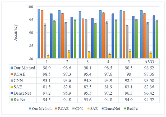 In order to verify the fault diagnosis performance of the proposed algorithm, the proposed method is compared with a residual convolutional autoencoder (RCAE) [23], sparse autoencoders (SAE), CNN, DenseNet, and ResNet. Detailed parameters of the other five methods are shown in Table 4. The classifier structure is the same as the EFENet network structure “2048-1024-256-7”. The RCAE architecture comprises two conv-pool layers and one deconv layer. The CNN network is composed of three conv-pool layers. The ResNet and DenseNet networks consist of a residual module and a dense connection block module (den), respectively. The convolutional kernel has a size of 3 and a stride of 1, while the pooling operation utilizes maximum pooling with a stride of 2. The batch size is set to 36 and the learning rate to 0.005. The comparison of the results of five different methods’ operations are shown in Figure 15. It is evident from the figure that each method exhibits an average classification accuracy of 98.52%, 97.36%, 93.58%, 82.36%, and 96.42%, respectively, with the SAE method demonstrating the lowest diagnostic accuracy. Notably, our proposed method surpasses CNN by a margin of 7% and ResNet by a margin of 4%. These comparative findings highlight the superior fault diagnosis performance achieved by our proposed approach, further validating the effectiveness of the information feature selection module and channel attention mechanism module in extracting bearing fault features from acoustic array signals.