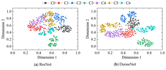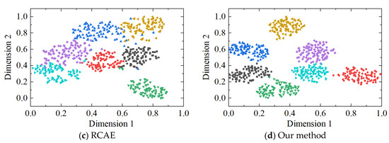 The t-SNE clustering results of the four methods are presented in Figure 16. It is evident from the figure that the fault clustering performance of the ResNet method is subpar, as all seven types of fault data appear to be intertwined without effective separation. While both the DenseNet and RCAE methods exhibit a relatively satisfactory ability to separate most of the fault data, there still exist instances of misclassification and indistinct boundaries. In contrast, our proposed method demonstrates superior classification effectiveness with distinct boundaries and substantial interclass spacing, further substantiating its superiority.