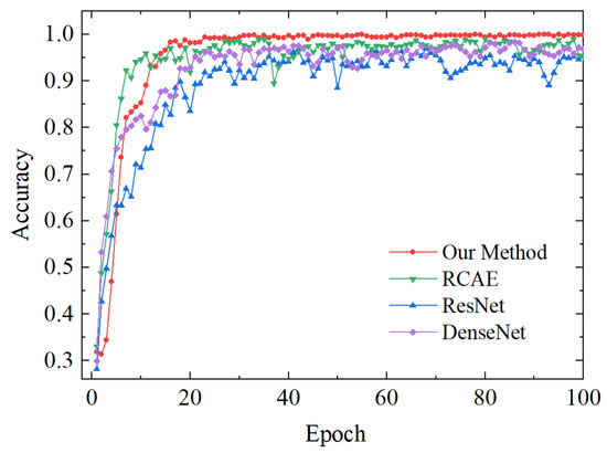 The accuracy curve during the training process of the four test sets is depicted in Figure 17. It can be observed from the figure that the RCAE method exhibits the most rapid convergence speed. However, this method’s accuracy is unstable, averaging 95%. The ResNet and DenseNet methods demonstrate relatively lower accuracies, reaching approximately 94% and 91%, respectively. In comparison to these approaches, our proposed method showcases a relatively fast convergence speed with a peak accuracy rate of 97%. Furthermore, our proposed method demonstrates stable convergence accuracy, providing further evidence for its ability to suppress noise and achieve high robustness under noisy conditions.