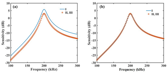 The structural parameters and material parameters for a 3D-CMUT with frequency of 200 kHz are shown in Table 1 and Table 2, respectively. According to the theoretical studies in Refs. [16,17], the frequency-dependent sensitivities of cell I, cell II, and cell III are depicted in Figure 2a, where, for cell I, the resonant frequency is 200 kHz, the amplification coefficient is RzUz = 105 Ω, and the peak sensitivity is 5.8614 dB; for cell II and cell III, the resonant frequency is 200 kHz, the amplification coefficient is Rx,yUx,y = 105 Ω, and the peak sensitivity is 3 dB. Based on the condition that Equation (3) is equal to Equation (4), we could obtain the relation of RzUz/Rx,yUx,y = 0.71957. Assuming the value of RzUz is 71,957 Ω, the value of Rx,yUx,y can be obtained as 105 Ω correspondingly. Therefore, the consistency of average sensitivity can be realized by setting the amplification coefficients of the piston-type CMUT (cell I) and the comb-like CMUT (cell II and cell III) as RzUz = 71,957 Ω and Rx,yUx,y = 105 Ω, respectively. Finally, Figure 2b shows the unified sensitivity, and the frequency-dependent sensitivities of cell I, cell II, and cell III show high consistencies.
