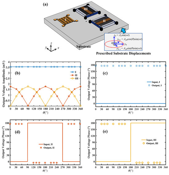 Figure 3c–e depict the input displacement phase and output voltage phase of cells I, II, and III as a function of the direction angle θ. It should be noted that as the angle θ changes, the y0 component along the x-axis or y-axis may have negative values. For instance, at θ = 120°, the y0 component along the x-axis is −0.5 nm. When the input displacement is a positive real number, its phase angle is 0°. Conversely, when the input displacement is a negative real number, its phase angle is 180°. As the direction angle changes, the phase angle of the input displacement alternates between 0° and 180°. As a result, there is always a phase difference of 180° between the input displacement of each element and the phase angle of the output current. This indicates that the symbols (positive or negative) of the input and output of each element are opposite at the resonance frequency of 200 kHz. This phenomenon can be explained by the vibrations of each element. For example, when the out-of-plane displacement of cell I is positive (i.e., the out-of-plane displacement is along the positive z-axis), it causes the upper electrode of cell I to vibrate in the positive z-axis direction. This results in an increase in the air gap height and a decrease in capacitance, leading to a negative current.
