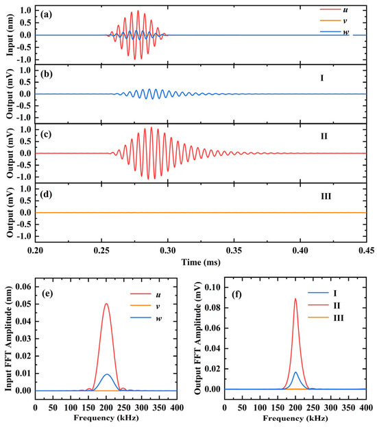 Figure 6b–d demonstrate the output results of A0 mode Lamb wave signals sensed by cells I, II, and III in 3D-CMUT. The output voltage amplitude of cell I is around 1.219 mV, cell II is approximately 0.7225 mV, and cell III is nearly 0 mV. The ratio of the output voltage amplitudes of cell I and II is 1.68, which is almost equal to the ratio of the out-of-plane displacement (z) amplitude of the Lamb wave signal reaching A0 mode to the in-plane displacement (x) amplitude. As the in-plane displacement (y) of the arrival signal is almost zero, cell III exhibits almost no voltage output. By utilizing fast Fourier transform (FFT), the input displacement spectrum and the output voltage spectrum of the 3D-CMUT device in the frequency domain can be obtained, as shown in Figure 6e and Figure 6f, respectively. It can be observed that the center frequency of the displacement signal reaching the receiving point, and the output voltage signal of each cell in the 3D-CMUT device, are both 200 kHz. Consequently, each cell successfully detects the A0 Lamb wave frequency of 200 kHz and its nearby guided wave three-dimensional signal.
