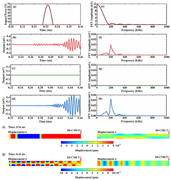 Results of detecting the acoustic emission signal from ball drop impact by 3D-CMUT. (a) The time-domain signal of the ball drop impact; (b) the output voltage of cell II; (c) the output voltage of cell III; (d) the output voltage of cell I; (e) FFT results of (a); (f) FFT results of (b); (g) FFT results of (c); (h) FFT results of (d); (i) the out-of-plane (w) and the in-plane (u) displacement distributions of the plate at 0.36 ms; (j) the out-of-plane (w) and the in-plane (u) displacement distributions of the plate at 0.42 ms.
