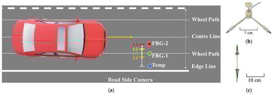 Photo of the (a) practical layout of the hybrid WIM system; (b) 3D; and (c) 1D GFRP-FBG sensors [].