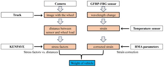 Figure 2 further shows the network of the hybrid WIM system, which combines an embedded sensor system utilizing in-pavement GFRP-FBG sensors with computer vision through a camera. The camera captures images of the moving vehicle, with a particular focus on the vehicle’s wheels. This enables the system to calculate the distance between the sensor and the wheel loading point, which is crucial for KENPAVE’s analysis. KENPAVE software is employed to compute stress factors, aiding in the understanding of pavement behavior under changing loading positions and environmental conditions. These stress factors are influenced by sensor installation depth and distance from the loading point, which play a significant role in the comprehensive analysis of the wander effect’s impact. As the vehicle passes over the installed GFRP-FBG sensor, variations in wavelength occur due to temperature and strain changes. Following temperature compensation via a temperature sensor, the strain induced by the vehicle’s passage can be computed after including the HMA parameter. Then, after combining the results through the hybrid WIM system, the weight of the vehicle can be determined.