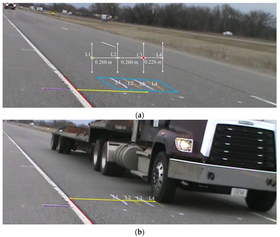 Despite the camera being properly set up and capturing images with the wheels, an issue arises in accurately determining the precise distance between the wheel loading position and the embedded sensor through the image due to visual perspective. Despite distance appearing shorter and the potential for actual distances to remain consistent, this issue persists due to a visual distortion arising from the image’s perspective, where objects positions farther away seem compressed, resulting in them appearing shorter even though their true distances remain unaltered. Within this study, the four marked lines (for locations L1 to L4), in conjunction with three calibration lines, hold a pivotal role in quantifying the distance between the wheel loading position and the embedded sensor. In scenarios where no vehicles are present, the four marked lines and three calibration lines are shown in Figure 3a. The known distance between the edge line and the four marked line traces on the road formed a pivotal aspect in defining the wheel’s location. This position is determined through the utilization of three calibration lines: