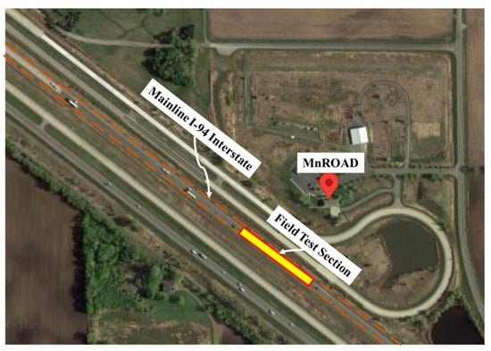 The field tests took place on a designated road within the MnROAD research facility, an establishment dedicated to pavement research and equipped with a range of pavement materials. Administered by the Minnesota Department of Transportation, MnROAD encompasses several roadways that each contain several test sections, with the majority of test sections located on the MnROAD Mainline (3 miles of I-94 WB interstate), Old I-94 Westbound (3.5 miles of the original westbound I-94 built during the 1970s), and a 2.5-mile low-traffic volume test track. This extensive site boasts over 80 distinct test sections strategically situated along both the mainline and original westbound I-94 segments. The field test for this study was carried out on a specified test section, as highlighted in Figure 4.