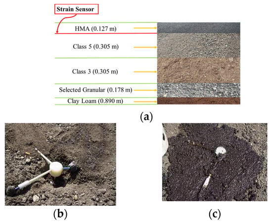(a) Flexible pavement cross section of the test section; (b) GFRP-FBG sensor placement above MNDOT class 5 granular base; (c) safeguarding GFRP-FBG sensor placement with HMA layer.