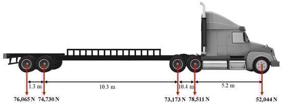 The field test utilized a semi-truck from the MnROAD facility, which had a total gross weight of 354,523 N. The vehicle configuration is illustrated in Figure 6. This study specifically concentrated on the weight measurement of the first axle equipped with a single tire.