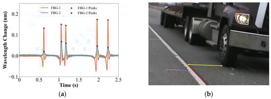 (a) Wavelength change generated by vehicle passage; (b) corresponding wheel loading position for FBG peaks.