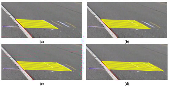 With the purple calibration line consistently employed for determining the camera’s location, the four distinctive marked lines at locations L1, L2, L3, and L4 each used the same red calibration line, along with 15 yellow calibration lines (as shown in Figure 8), which differed for each location. The lengths of the red and yellow calibration lines, measured in meters, are presented in Table 4.