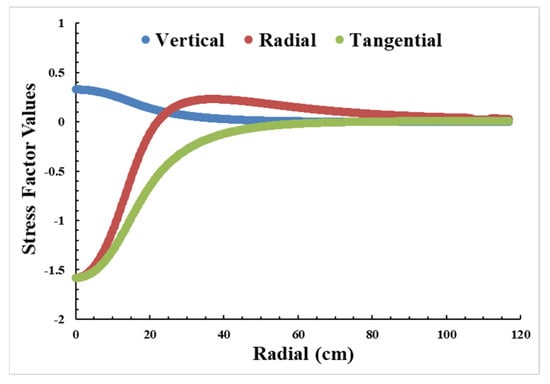 The pavement information, as shown in Table 6 [,,], the contact pressure, and the contact radius of the one wheel were input to the software KENPAVE to generate the stress when the distance between the center of the contact area and the sensor (installed 0.127 m under the road) was from 0 to 1.168 m. The software generated a comprehensive array of outputs, including vertical, radial, tangential, shear stress, and vertical displacement data, covering a radial coordinate range from 0 to 116.8 m. This research employed the vertical, radial, and tangential stress relative to weight to derive vertical, radial, and tangential factors (as depicted in Figure 9). Subsequently, these factors contributed to the utilization of Equation (9) for the determination of vehicle weight.