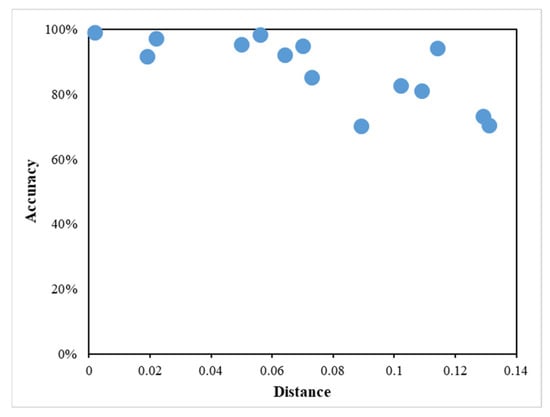 Having acquired the strain, distances between the sensors and wheel loading position, and the fitted stress factor to these distances, the calculation of the wheel load for the first right single wheel became feasible. Considering the same vehicle positioned differently during each drive, Table 7 provides the computed distances between the wheel and the sensor, calculated weight, and accuracy. The weight of the first right single wheel was assumed to be one-half of the weight of the first axle, which totals 26,022 N. This value was utilized as the actual weight of the first right single wheel for accuracy assessments. Generally, accuracy is closely linked to the distance between the wheel loading point and the sensors. For the FBG-1 sensor, the average accuracy reached 87.831% when the absolute distance from the FBG sensor to the wheel loading point was less than 0.089 m, decreasing to 84.206% when the distance fell below 0.131 m. Meanwhile, the FBG-2 sensor achieved an average accuracy of 94.645% when the sensor-to-wheel loading point distance was less than 0.070 m. When the distance is less than 0.109 m, the FBG-2 sensor will maintain an average accuracy of 91.027%. Figure 10 illustrates the alteration in vehicle measurement accuracy in response to changes in the distance between the two embedded GFRP-FBG sensors and the wheel loading position. As the distance between the sensors and the wheel loading position increases, there is a noticeable and consistent reduction in measurement accuracy. This observation underscores the importance of maintaining relatively close proximity between the sensors and the wheel loading point for optimal accuracy in vehicle weight measurement. Therefore, it is recommended to install the GFRP-FBG sensors approximately every 0.09 m and 0.07 m to achieve around 85% and 95% accuracy, respectively. Considering the significance of both driving speed and the distance between the wheel loading point and the FBG sensor, it is worth noting that this study primarily focuses on analyzing the distance’s impact on the results. This choice is driven by the practical challenge of controlling heavy trucks to drive at the same speed and in the same location. To validate the influence of speed on the measurement results, it is imperative to conduct additional runs with consistent speeds and controlled wheel loading positions. Further analysis of speed’s impact on measurement accuracy will be incorporated into future research.