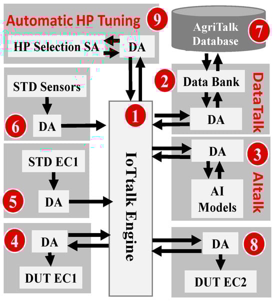 Figure 2 illustrates the SensorTalk3 architecture. The SensorTalk server consists of three components. The IoTtalk engine (Figure 2 (1)) [26] is responsible for interaction with the IoT devices. The DataTalk module (Figure 2 (2)) is responsible for data preprocessing (feature extraction). The AItalk module (Figure 2 (3)) is responsible for AI prediction. An IoT device interacts with the IoTtalk Engine through the Device Application (DA). It is interesting to note that from the viewpoint of the IoTtalk Engine, both DataTalk and AItalk are managed as IoT devices.