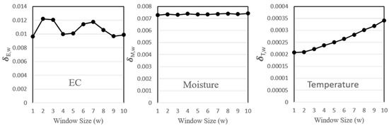 SensorTalk3 is sensitive to the change rate of temperature, moisture and EC in 40 s (i.e., w = 2), and the changes larger or smaller than 40 s have a smaller impact on the calibration. Our study also indicated that the accuracies of moisture/temperature are not significant in terms of EC calibration. Specifically, if the error rates of uncalibrated moisture and temperature sensors are under 8.3%, SensorTalk3 can still calibrate EC well.