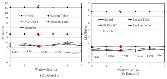 In Figure 4, if the change rate features are not used (as most previous approaches did), then the MAPEs for Datasets 3 and 4 are 3.516% and 1.83%, respectively. When the change rate with the window size 2 is used, the MAPEs are reduced to 3.18% (for Dataset 3) and 1.738% (for Dataset 4), respectively.