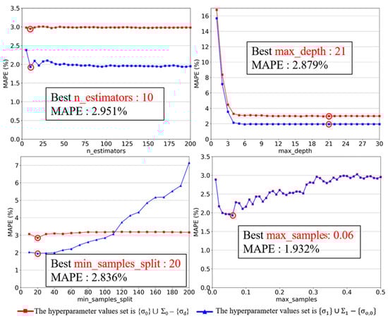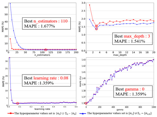 The red square curves in Figure 5 show the MAPE against for XGBOOST in Part 1. The values selected are 110 for 3 for , 0.08 for , and 0 for . Then, we perform Part 2 (Lines 9–16). Part 2 is the same as Part 1 except that is used instead of The blue triangle curves in Figure 5 show the MAPE against for XGBOOST in Part 2. The values selected are the same as those in Part 1, that is, in Line 9.