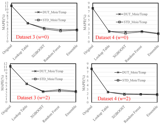 Based on the AI models described in Section 4, the MAPE performance of the original method, lookup table method [6,7], XGBOOST, Random Forest, and SensorTalk3 (Ensemble) are shown in Table 2. The table indicates that SensorTalk3 significantly reduces the MAPEs from 11.159% to 3.187% for Dataset 3, and from 7.792% to 1.738% for Dataset 4.