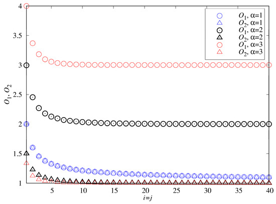 The overheads O1 and O2 are the same when α = 1. When α = 2 and 3, O1 is twice and triple of O2, respectively. If then and are exponential distributions with different means, and Equation (14) is rewritten as