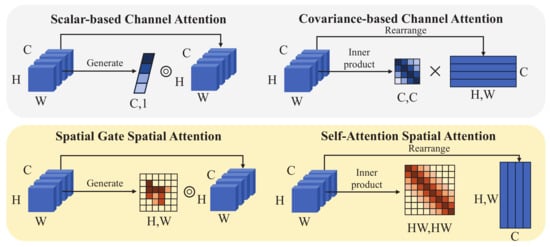 Schematic diagram of channel attention and spatial attention in different paradigms.