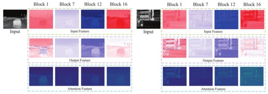 We construct a network composed of attention modules to explore the properties of the attention mechanism in thermal image SR task. The LR thermal image first passes through a convolutional layer to extract shallow features, then sequentially extracts deep features by 16 attention blocks, and finally outputs the HR thermal image through an upsampling module. The proposed attention module consists of sequential channel and spatial attention blocks such that each pixel in the feature map can be rescaled independently. We visualize the feature maps of the outputs of some attention modules as shown in Figure 2. As shown in Figure 2, the behaviors of attention modules at different depths are quite different, even diametrically opposite. The shallow attention modules extract low-frequency features, i.e., flat regions are enhanced, the tail attention modules enhance high-frequency information, and the middle modules mix the above two operations.