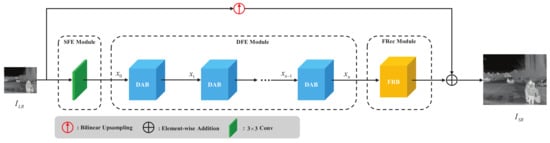 - Shallow feature extraction (SFE) module. The input LR thermal image first passes through an SFE module consisting of a 3 × 3 convolution kernel to extract low-level features. Our experiments show that using a single 3 × 3 convolution is a acceptable balance between performance and parameters.