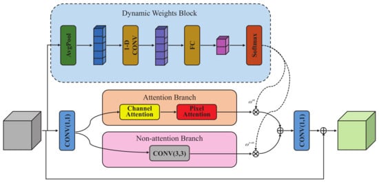 where and represent the weights of the attention branch and the non-attention branch, respectively. is the output of the attention branch, and is the output of the non-attention branch. is a convolution layer with a convolution kernel size of 1 × 1.
