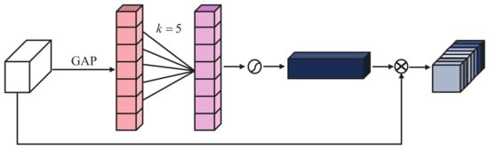 where RELU is the rectified linear unit [52]. As the weights of the channel reduction layer and channel increase have sizes and respectively, r is an adjustable attenuation parameter. The above operation reduces the parameter burden but destroys the direct one-to-one correspondence between channels and weights [53]. One weight element of a fully connected layer utilizes all channel information; however, the operation shown in Equation (4) first maps full-size features to a low-dimensional space, and then maps back to a high-dimensional space. The direct relationship between channels and weights is broken. We show that 1D convolution elegantly preserves the explicit correspondence between channels and weights.