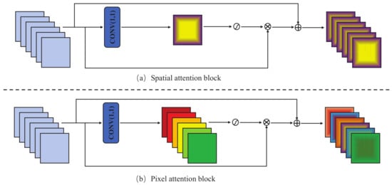 The overall structures of the spatial and pixel attention blocks. (a) Spatial attention block. (b) The proposed residual pixel attention block.