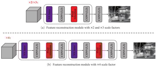 The FRec module is used to reconstruct the outputs of the DFE module into the final HR thermal image. There are few works that carefully design upsampling modules. We design two FRec modules for ×2/×3 and ×4 scale factors, respectively, as shown in Figure 7.