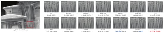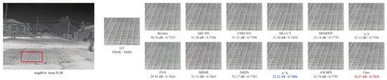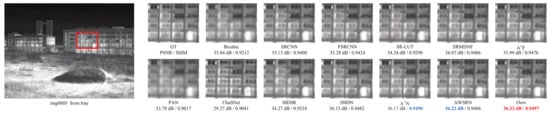 Specifically, Figure 8 shows on the thermal image img0005 from the Iray test dataset with the ×2 scale factor that our LDASRNet achieves a PSNR metric that is 0.11 dB higher than the second-best model AWSRN, i.e., 36.33 dB vs. 36.22 dB. Similarly, Figure 9 exhibits that LDASRNet outperforms the second-best and third-best networks by 0.05 dB/0.0012 and 0.09 dB/0.0027 in terms of the PSNR/SSIM metrics, respectively, and still achieves the highest quantitative measurements. Figure 10 indicates that LDASRNet achieves the maximum performance gain on the ×4 scale factor of the Challenge test dataset for the img0037, with a PSNR of 35.22 dB and SSIM of 0.9195, outperforming and AWSRN by 0.31 dB and 0.0042, respectively.