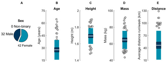 Participant (A) sex, (B) age, (C) height, (D) mass, and (E) self-reported average distance run per week. The white horizontal line represents the mean; dark blue represents ±95% confidence interval (±1.96 SEM) around the mean; and light blue represents ±1 SD around the mean. Gray dots represent participants outside ±1 SD.
