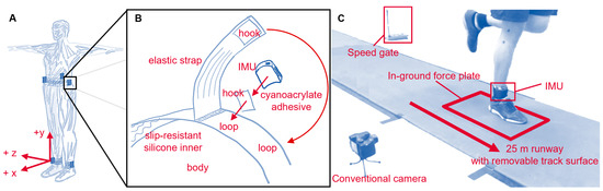 Participant mass, height, and distance of the left and right lateral malleolus, fibular head, lateral epicondyle, and superior aspect of greater trochanter from the ground were measured. Using adhesive-bonded hook-and-loop fasteners, IMUs were attached to neoprene belts with anti-slip silicone inners, then wrapped with elastic straps as tightly as possible, within the limit of participant comfort. IMUs were placed anterior and superior to the lateral malleoli (shank), on the superior aspect of the iliac crests in line with the greater trochanter (hip), and on the superior aspect of the sacrum in line with the spine (sacrum) (Figure 2).