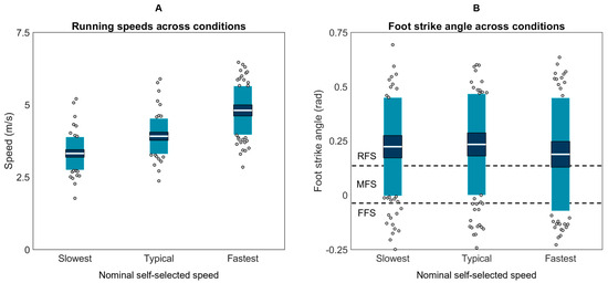 (A) Mean speeds and (B) foot strike angles used by each participant across the slowest, typical, and fastest running speed conditions. The white horizontal line represents the mean; dark blue represents ±95% confidence interval (±1.96 SEM) around the mean; and light blue represents ±1 SD around the mean. Gray dots represent participants outside ±1 SD. RFS is rear foot strike, MFS is mid foot strike, and FFS is fore foot strike.