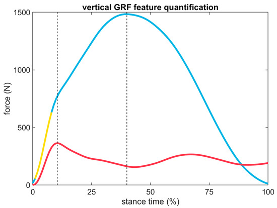 Vertical GRF (blue) and HiF reconstruction (red) for an example stance. Vertical dashed lines indicate the timing of first and second vertical GRF peaks. Note, although the first peak is difficult to visually identify in the original signal (blue), a consistent point in the HiF signal can still be identified (red). The yellow highlighted region from 20 to 80% of the first peak was used to calculate the loading rate.