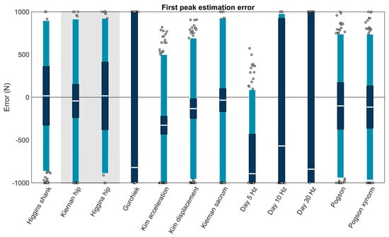 Bias (white bar), ±RC (dark blue), and ±LOA (light blue) in first peak estimation for each capable method. Gray dots represent trials falling outside the LOA. Values outside ± 1000 N are plotted at the axis limits. A value of 0 represents perfect agreement with the force plate. Positive values indicate the method overestimated the first peak. Negative values indicate the method underestimated the first peak. The method with a white background on the left is for accelerometers on the shank, methods with a gray background are for the hip, and methods with a white background on the right are for the sacrum.