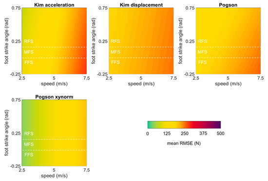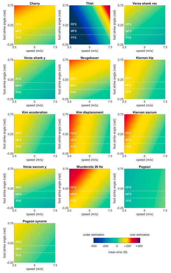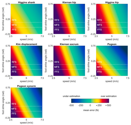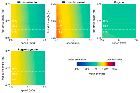 Bias in average force estimates predicted by mixed effects models for each of the best performing methods, plotted as a function of speed and foot strike angle. Green values represent perfect agreement with the gold standard; yellow, red, and purple values represent positive biases (overestimates); darker blue values represent negative biases (underestimates). Foot strike angles corresponding to rear-, mid-, and fore-foot strike patterns are labelled (RFS, MFS, and FFS) and divided with dashed white lines.