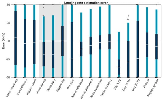 Three methods were capable of estimating loading rate from shank accelerations and were among the best performing methods (biases < 10 kN/s): ‘Veras shank res’ (+4.37 ± 62.56 kN/s or +8.26 ± 118.16%; bias ± LOA), ‘Veras shank y’ (−3.25 ± 59.96 kN/s or −6.13 ± 113.25%), and ‘Higgins shank’ (−1.71 ± 56.69 kN/s or −3.23 ± 107.08%). Three were capable of estimating loading rate from hip acceleration but only ‘Higgins hip’ was among the best performing (+0.02 ± 52.36 kN/s or +0.04 ± 98.90%). Ten methods were capable of estimating loading rate from sacrum acceleration, of these, the best performing were: ‘Kim displacement’ (−6.34 ± 50.52 kN/s or −11.98 ± 95.43%), ‘Veras sacrum res’ (−1.95 ± 49.34 kN/s or −3.68 ± 93.19%), ‘Veras sacrum y’ (−1.04 ± 50.52 kN/s or −1.96 ± 95.42%), ‘Pogson’ (−5.32 ± 51.82 kN/s or −10.04 ± 97.87%), and ‘Pogson xynorm’ (−7.83 ± 51.21 kN/s or −14.80 ± 96.73%) (Figure 7).