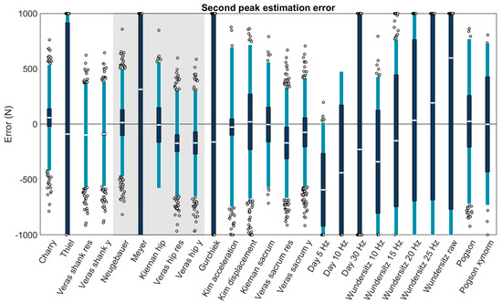 Bias (white bar), ± RC (dark blue), and ± LOA (light blue) in the second peak estimation for each capable method. Gray dots represent trials falling outside the LOA. Values outside ± 1000 N are plotted at the axis limits. A value of 0 represents perfect agreement with the force plate. Positive values indicate the method overestimated second peak. Negative values indicate the method underestimated second peak. Methods with a white background on the left are for accelerometers on the shank, methods with a gray background are for the hip, and methods with a white background on the right are for the sacrum.