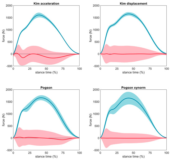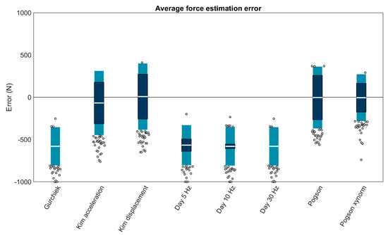 Eight sacrum methods could calculate the average force from an estimated time series, the four best performing (biases < 100 N) were: ‘Kim acceleration’ (−67.76 ± 381.52 N or −6.87 ± 38.68%; bias ± LOA), ‘Kim displacement’ (+7.66 ± 394.37 N or +0.78 ± 39.98%), ‘Pogson’ (−3.18 ± 367.81 N or −0.32 ± 37.29%), and ‘Pogson xynorm’ (−4.87 ± 278.80 N or −0.49 ± 28.26%) (Figure 11).