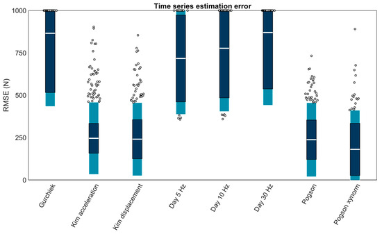 Mean RMSE (white bar), ± RC (dark blue), and ± LOA (light blue) in time series estimation for each capable method. Gray dots represent trials falling outside the LOA. Values > 1000 N are plotted at the axis limit. A value of 0 represents perfect agreement with the force plate. Positive values indicate larger errors. All methods were for the sacrum.