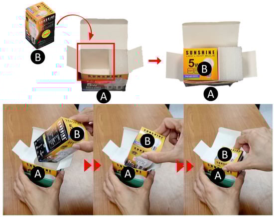 Example of a compliant box-in-box insertion where a folding carton (box B) containing an electric light bulb is to be inserted into a receptacle folding carton (box A). Manual insertion performed by a human (bottom).