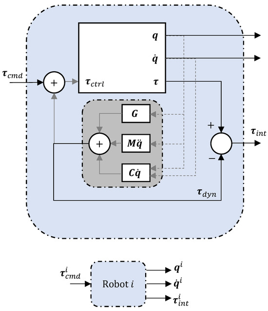 The block at the bottom of Figure 3 is a simple representation of the control block of any robot i, with the associated control and feedback signals marked by the superscript . In order to establish a master–slave behaviour, two such robots are connected together as depicted in the block diagram in Figure 4. As per the notation in the control block diagram above, we mark the control and feedback signals for master and slave with superscripts m and s, respectively (for example, the feedback joint configuration for the slave is represented as ).