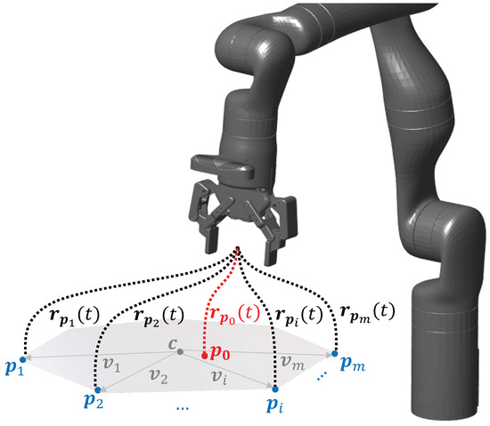 Bringing this to the task perspective (See Figure 5), assuming that the initial object positions in the 2D plane, which are observed by the robot at time (in the picking phase of the trial) across m trials, i.e., ]: , form a convex polygon, for m different initial positions of box B, any arbitrary object position (for brevity, henceforth, we omit indicating that the barycentric coordinates are being evaluated on the demonstration data at time , i.e., for different initial positions of box B at the time of picking) within the polygon can be represented in terms of a set of barycentric coordinates such that: