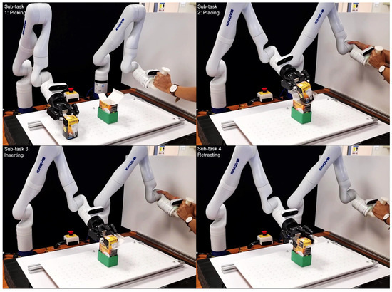 Performing GMR outputs a trajectory for each sub-task, and the overall robot trajectory for the experiment is characterised by executing the trajectories for all the subtasks, namely pick, place, insert, and retract (, , and , respectively) in order.