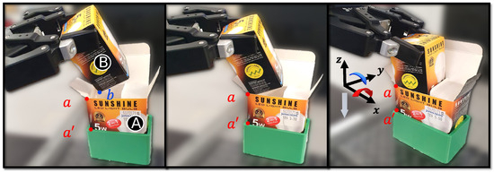 Subsequently, the vertex of box B is pushed against the edge, followed by a simultaneous rotation about the axes and a translation along the Z axis. Here, the compliance introduced by the elastic nature of box B guides box A into B, assisting with the insertion task. Once the insertion is performed, the gripper is opened and the retraction sub-task is executed to move the robot away to a safe position.