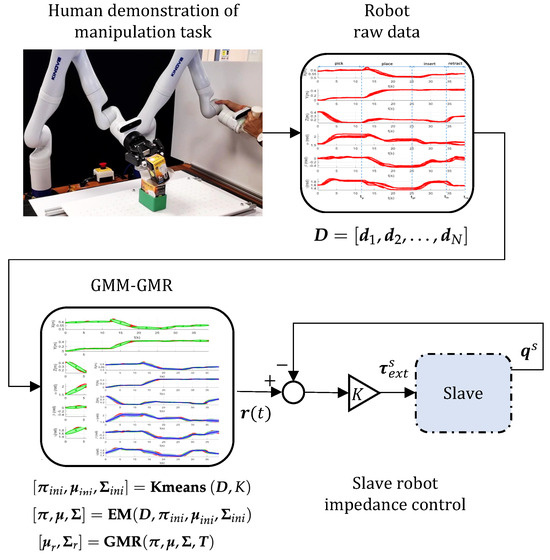 From the human demonstration of manipulation task, sample dataset with representing the robot position and orientation in the world frame is collected. Here, , and represent the time taken for each of the sub-tasks (pick, place, insert, and retract, respectively). Then, the GMM fitting is performed with components and the corresponding Gaussian regression allows one to compute the trajectory , which is fed as the input to slave robot impedance control.