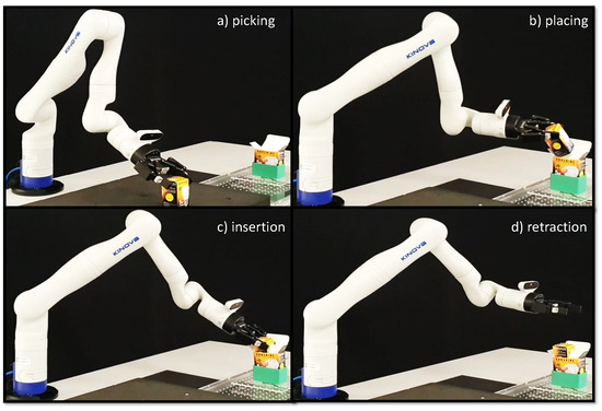 Considering that the task at hand is a tight-tolerance insertion task, insertions performed with a vertical approach vector are highly likely to fail. As such, the passive compliance provided by the boxes is exploited to perform a successful insertion. This can be seen in the insertion sub-task, divided into three sub-stages, with reference to Figure 7.