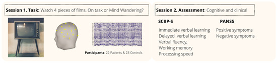 Participants were informed that they would watch four film clips and would be asked intermittently whether they were focusing on the content of the video or on their own unrelated thoughts. The movie would pause, approximately every 50 s, and then a message would appear on screen, where participants were asked to indicate whether they had been concentrating on the video (referred to as the “attention-to-task condition”) or whether they had stopped paying attention to the video and had been focusing on internal stimuli, such as thoughts, mental images, or memories unrelated to the task at hand (referred to as the “attention-to-mind condition”). A researcher, who could not be seen by the participant, recorded the verbal responses by entering a numerical code into the EEG recording. This message remained for about 10 s, which was the time the participants had to respond. After this time, the movie would resume until the next question. In a second subsequent session, participants underwent a cognitive assessment using the Spanish adaptation of the screen for cognitive disability in psychiatry (SCIP-S). Following this assessment, for participants who were patients, a clinician administered the Spanish version of the positive and negative syndrome scale (PANSS). A summary of the experimental setup is presented in Figure 1.