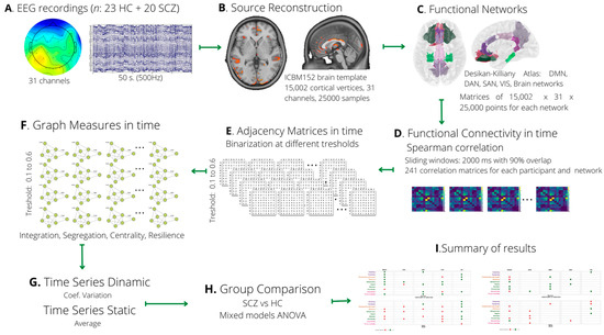 Research studies employing EEG have identified various patterns of brain activity in individuals diagnosed with SZ. These findings include alterations in oscillatory activity, such as increased theta and delta activity, and decreased alpha and beta activity in specific brain regions [9,10,11,12]. These abnormalities may reflect disturbances in neural synchronization and information processing in cortical circuits. Additionally, functional connectivity studies have revealed alterations in the connectivity between brain regions in individuals diagnosed with SZ. Disruptions in large-scale networks, including the default mode network and the fronto-parietal network, have been observed, suggesting impaired integration and coordination of neural activity [13,14,15].